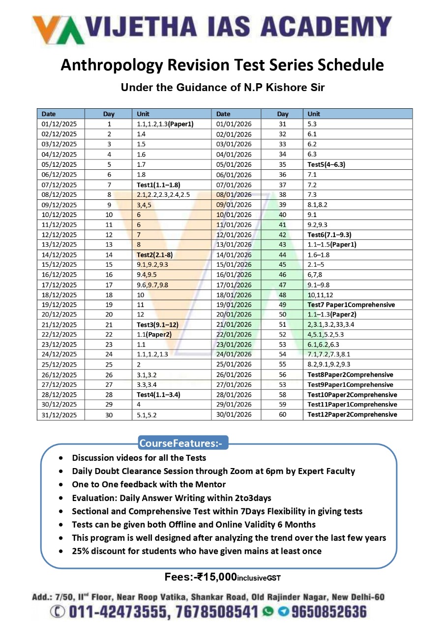 Preparing for UPSC Anthropology Optional requires a structured plan, timely revision, and regular practice through tests. To help aspirants strengthen their preparation, Vijetha IAS Academy, under the guidance of N.P. Kishore Sir, has launched a well-planned Anthropology Revision Test Series (2025–2026). This test series is designed to help students revise the entire syllabus systematically while improving answer-writing skills essential for UPSC Mains.