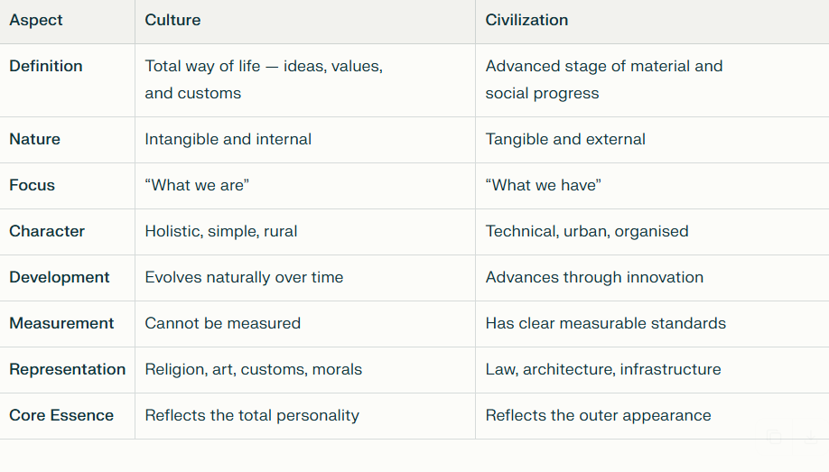Civilization, in contrast, refers to the advanced stage of human social and material development. It is the outcome of human intelligence, organisation, and progress. Civilization answers the question “What we have.”